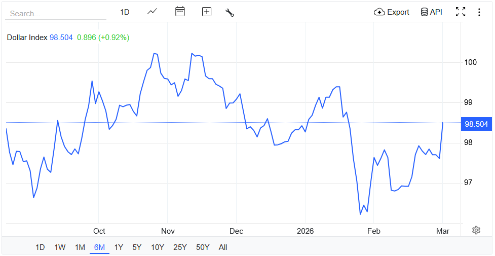 由于油价上涨促使交易员减少对美联储今年降息的押注、以及避险情绪的推动,美元兑所有主要货币走强。截至发稿,美元指数(DXY)涨0.82%至98.504,为1月22日以来的最高水平。