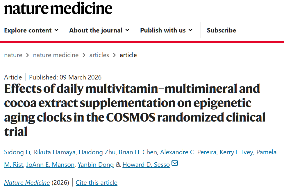 [1]Li, S., Hamaya, R., Zhu, H. et al. Effects of daily multivitamin–multimineral and cocoa extract supplementation on epigenetic aging clocks in the COSMOS randomized clinical trial. Nat Med (2026). https://doi.org/10.1038/s41591-026-04239-3